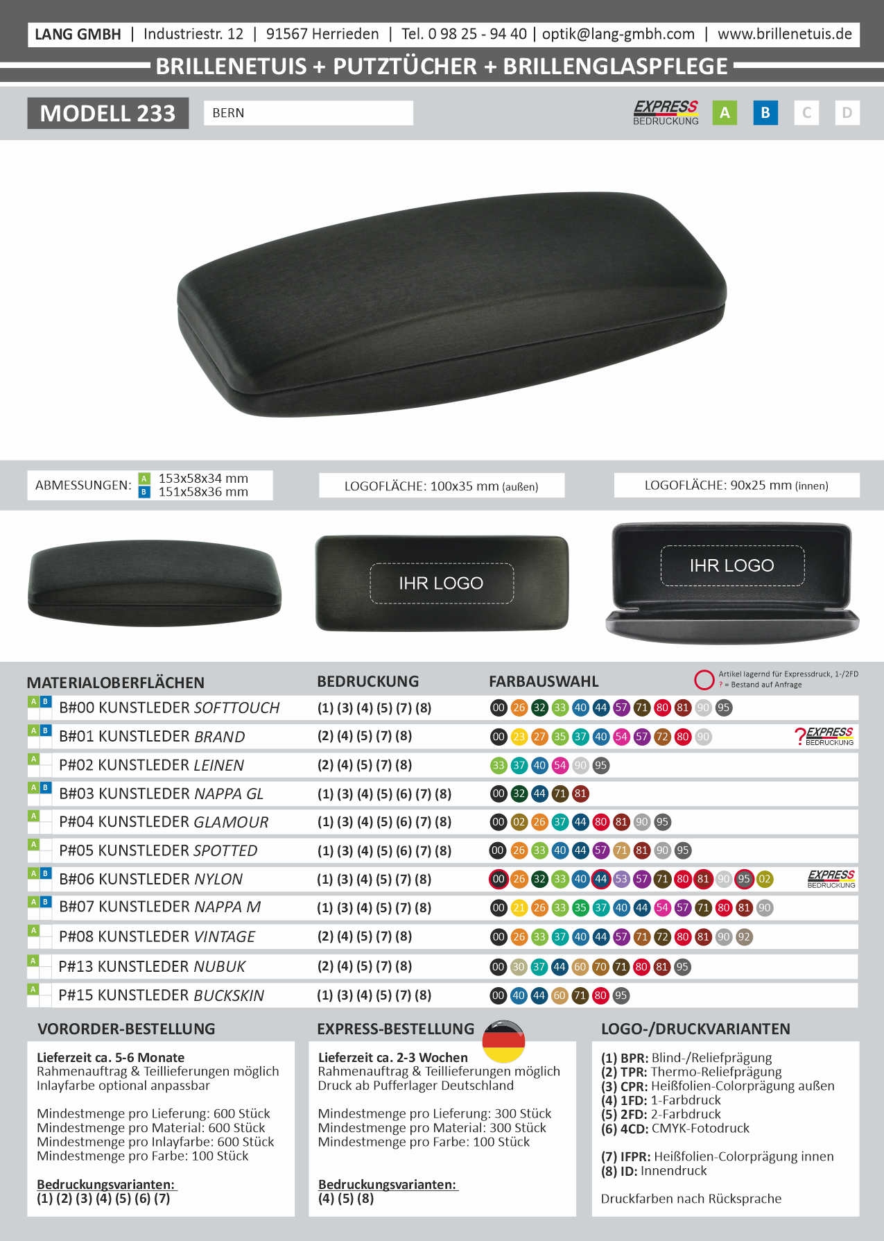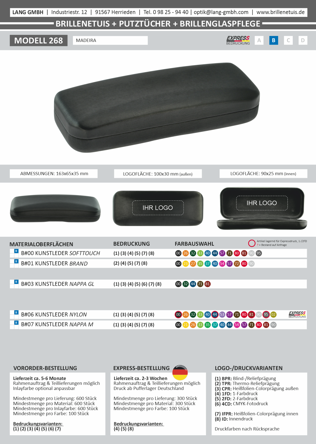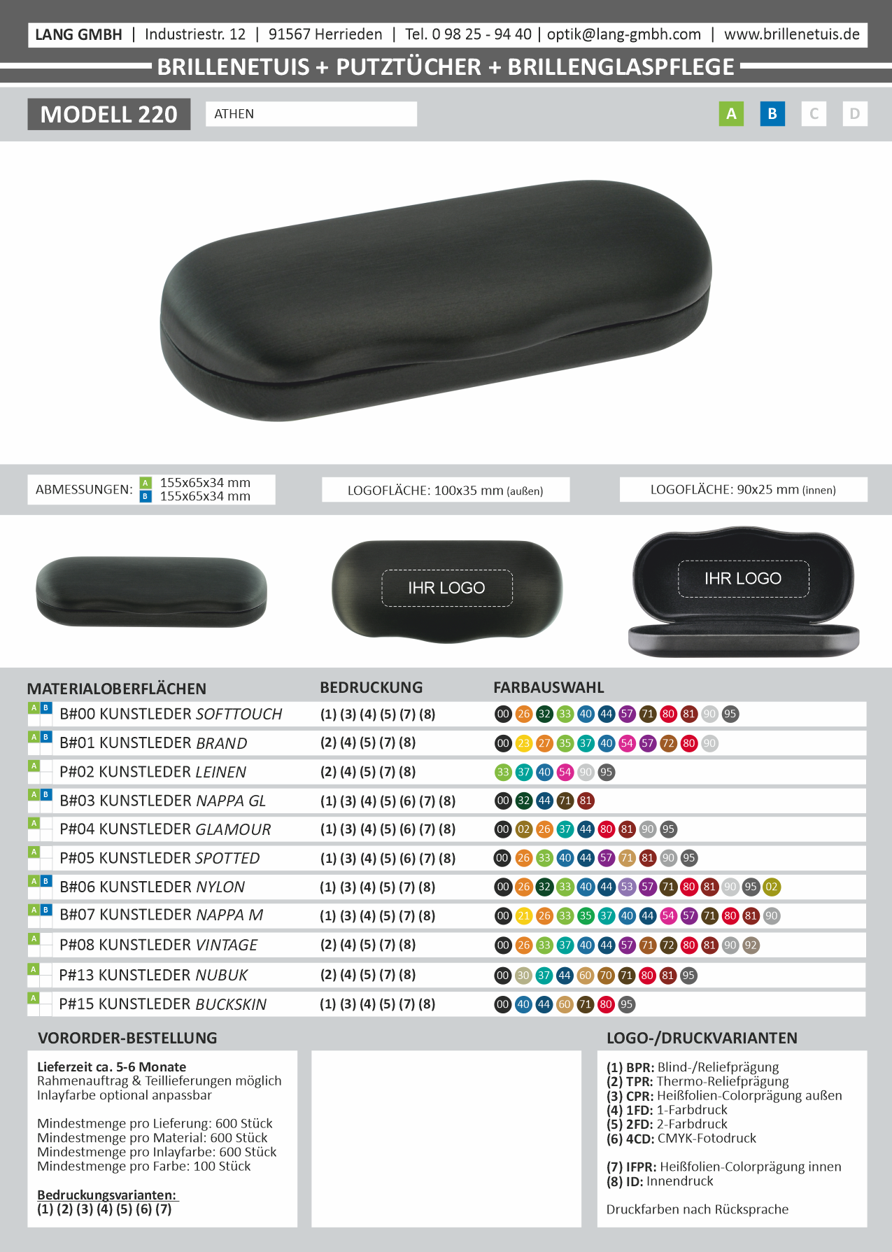 Für unsere Metallkern-, Klapp- und Faltetuis stehen folgende Kunstleder als Obermaterial zur Verfügung: